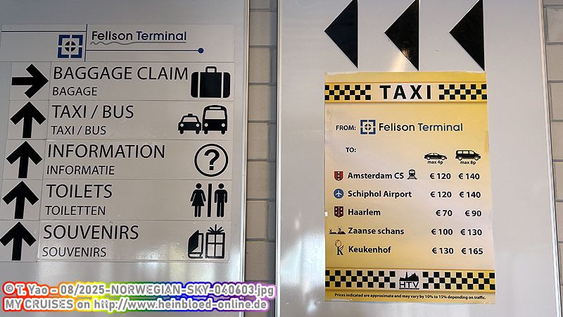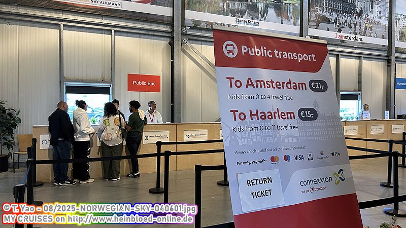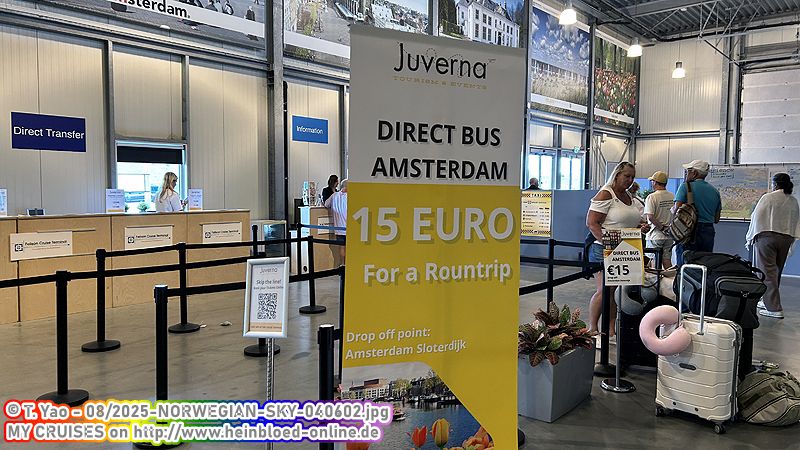 Wir gehen in das Felison Cruise Terminal in IJmuiden rein. Hier werden für die Passagiere reine Bustransfers von Juverna für 15 EUR (2025 / hin- und zurück) angeboten. Sie fahren nach Amsterdam Sloterdijk und von hier aus muss man weiter mit der U-Bahn fahren. Connexxion betreibt den öffentlichen Busverkehr vor Ort und fährt auch direkt nach Amsterdam Sloterdijk. Für 21 EUR (2025) bekommt man nicht nur die Hin- und Rückfahrt,, sondern auch eine Tageskarte für die U-Bahn, Straßenbahn und den Bus in Amsterdam. Eine Tageskarte in Amsterdam kostet 9,50 EUR (2025). D.h. man muss dann mit dem direkten Bus doch mehr bezahlen, wenn man weiter in die Stadt will. Es wären noch 5 km / 1:15 hrs bis zum zentralen Platz in Amsterdam: Dam. Ein Taxi in die Innenstadt von Amsterdam kostet zwischen 120 EUR und 140 EUR (2025).