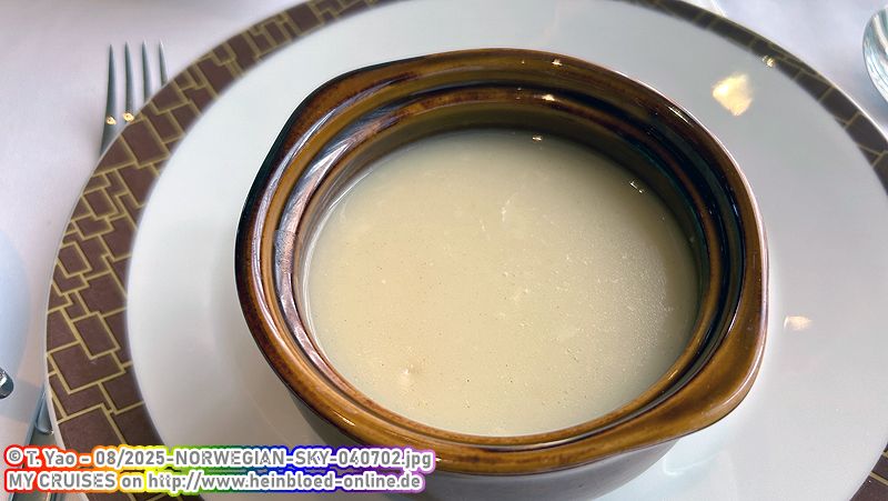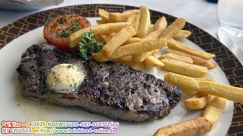 Wir freuen uns, dass wir langjährige gute Freunde von der NCL-Crew besuchen dürfen: HGM Jean-Michel, Ana und Vhina erwarten uns. Ana kennen wir von unserer Reise auf der NORWEGIAN GEM 2009. Jean-Michel seit unserer Reise auf der NORWEGIAN JADE 2014 (2). Vhina ist seine aktuelle rechte Hand. So zeigen sie uns das Schiff. Rundum erneuert. Ich bin so sprachlos und erkenne es nicht wieder. Da deren Zeit begrenzt ist und wir nicht alleine durch das Schiff laufen dürfen, halte ich nicht überall zum Fotografieren. Zuletzt waren wir damit auf unserer Reise NORWEGIAN SKY 2015 unterwegs. Da hatte man schon den Eindruck, dass NCL nicht mehr sehr viel Spaß an diesem Schiff hat. Aber sie ist jetzt leider verkauft und wird 2026 die Flotte verlassen. Deswegen wollte ich mich vom Schiff verabschieden. Nach der Modernisierung wundert es mich nicht, dass man für die Reisen mit ihr auch schon höhere Preise verlangen kann. Wir essen im Le Bitro gemeinsam zu Mittag. Es gibt mal wieder für mich Steak et Frites.